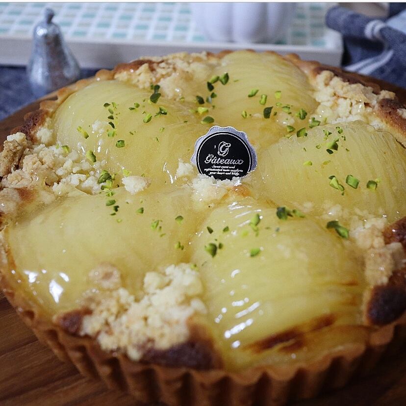 サクサククッキー生地に、ふっくらと美味しそうなアーモンド生地、爽やかな洋梨のコンポートがたっぷり入ってみずみずしく、周りのクランブルがカリッと香ばしいケーキです♪